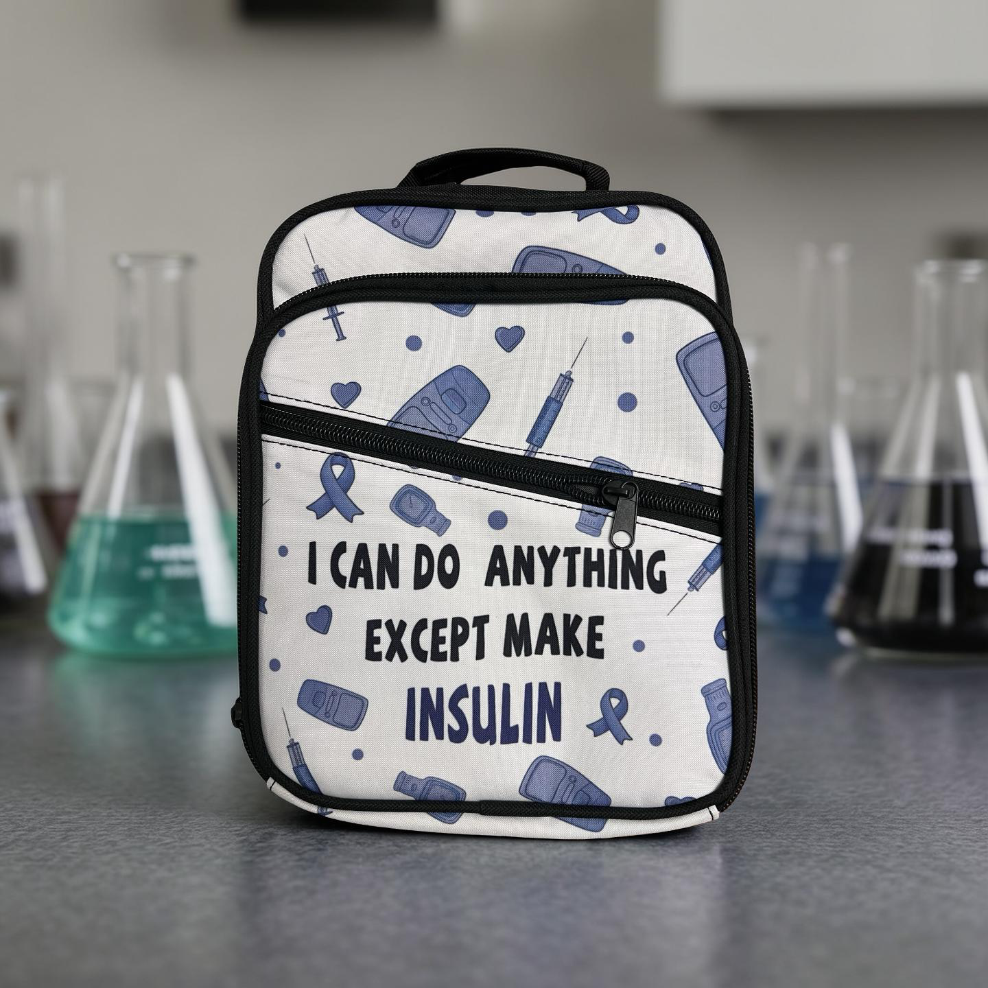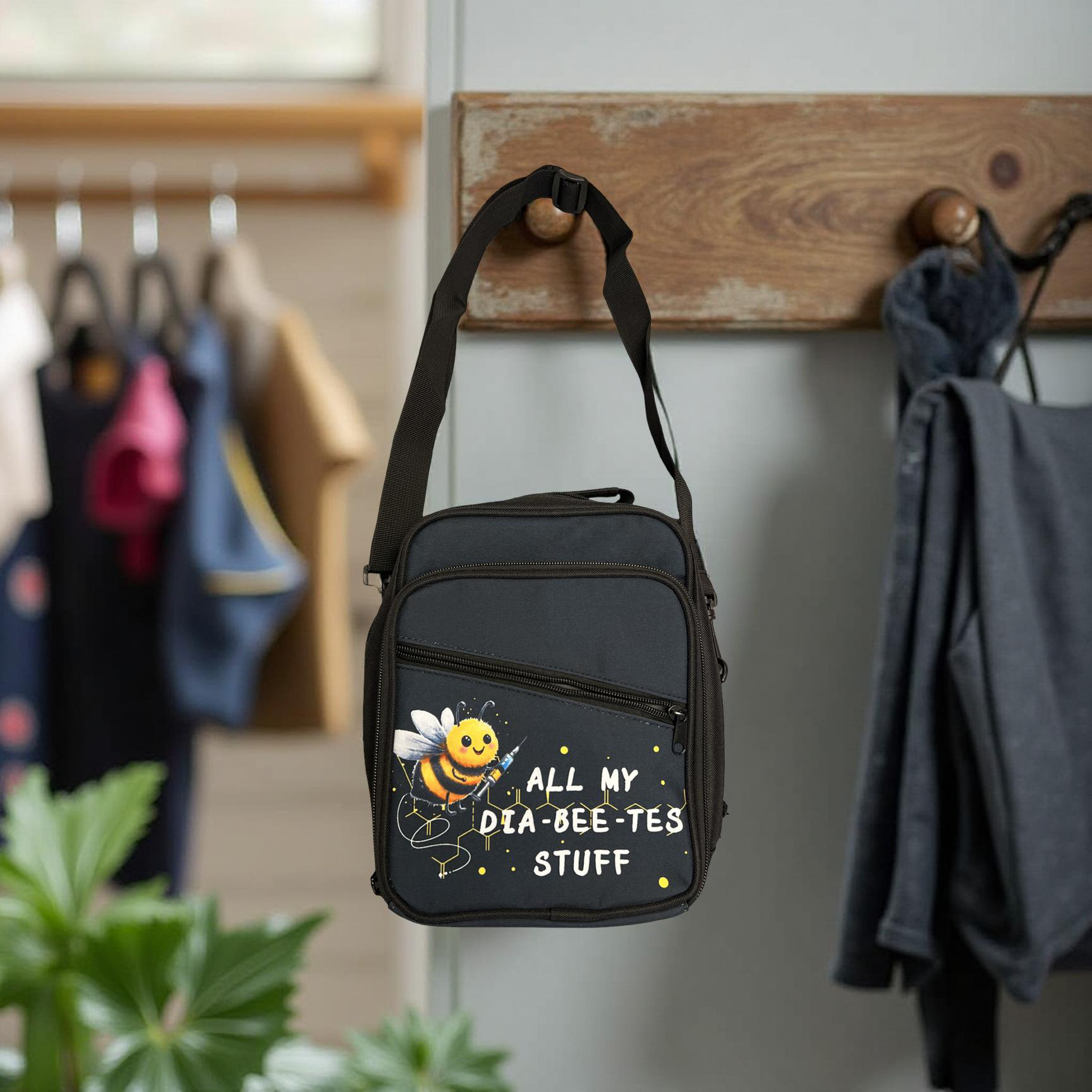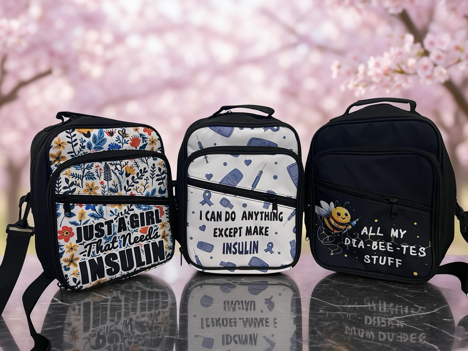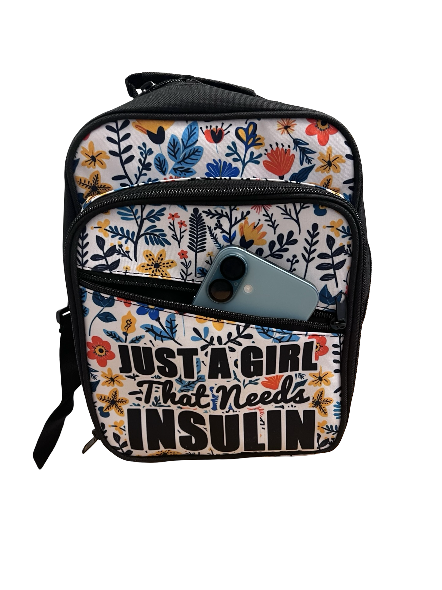 Roomy cross body bag with insulated front pocket, with multiple compartments for items such as insulin pens, cgm readers, insulin, test strips, dia wipes, skin tac etc.